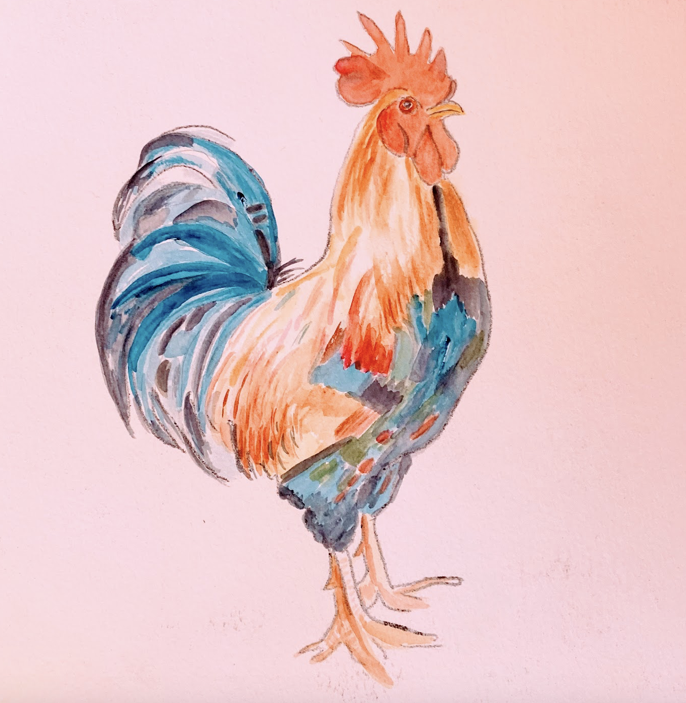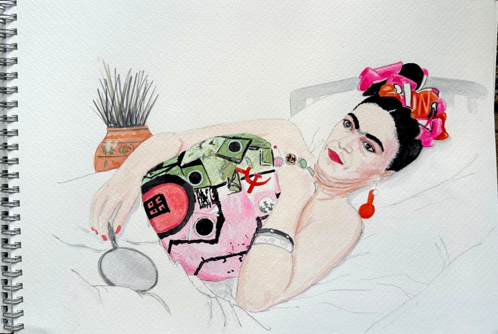 Brenda’s colourful picture of Frida Kahlo is in pastels as are her images of the dragon and the parrot on a dictionary page. The cockerel is painted in watercolours.