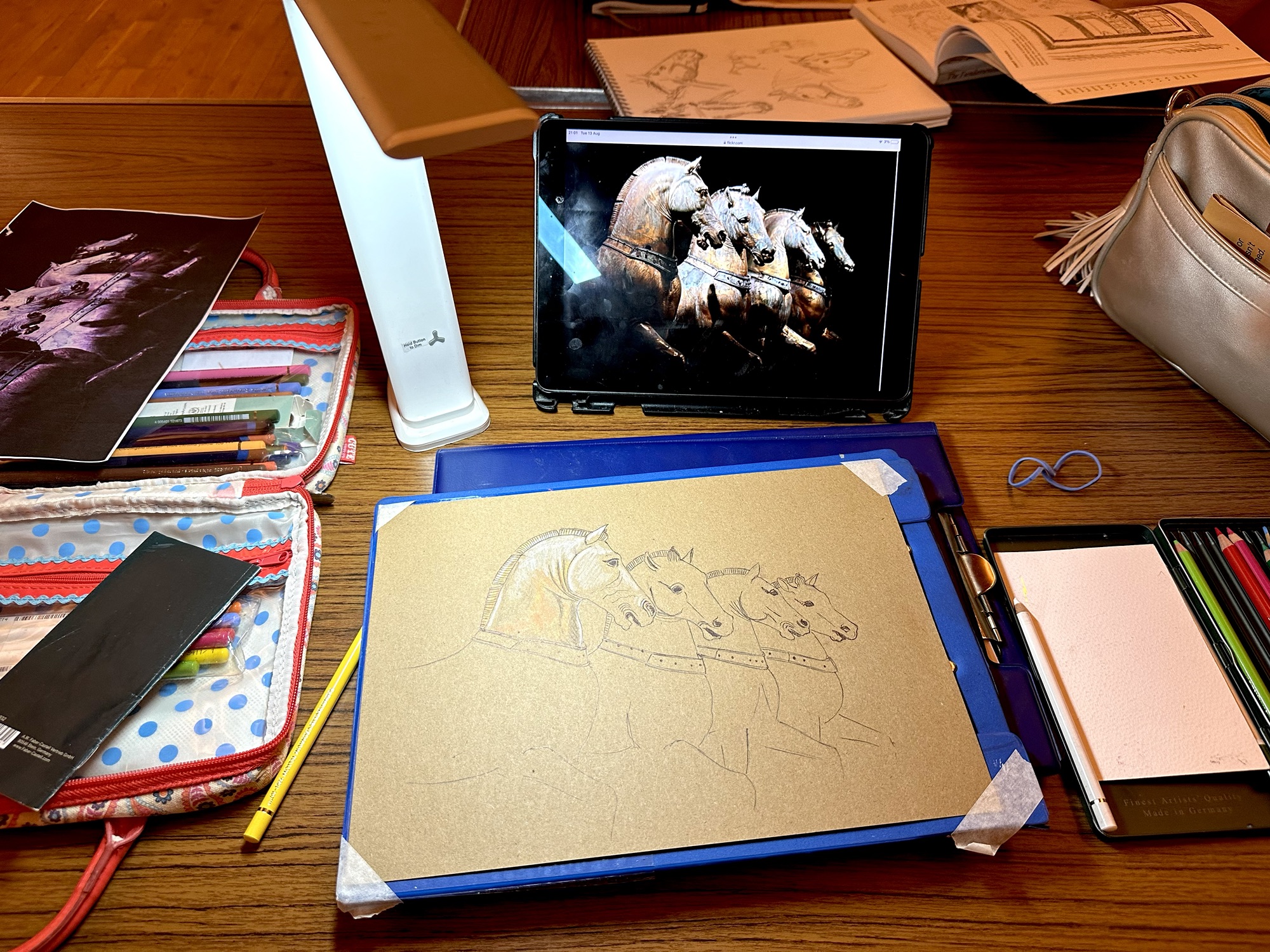 Tracy chose the Triumphal Quadriga as her subject, otherwise known as the Horses of Saint Mark, in St.Mark’s Basilica in Venice. Believed to have been sculpted in the 2nd or 3rd century CE in Rome or possibly the 5th or 4th century BCE in Greece, they were displayed for centuries at the Hippodrome of Constantinople until the sack and looting of the city by Venetian forces in 1204 during the Fourth Crusade. The four horses were then mounted above the entrance of the basilica in Venice until they were looted by Napoleon in 1797 and taken to Paris, but were returned to Venice in 1815. Copies of the four horses are now outside St. Mark’s Basilica whilst the originals are displayed inside under spotlights which highlight the original mercury gilding that remains.