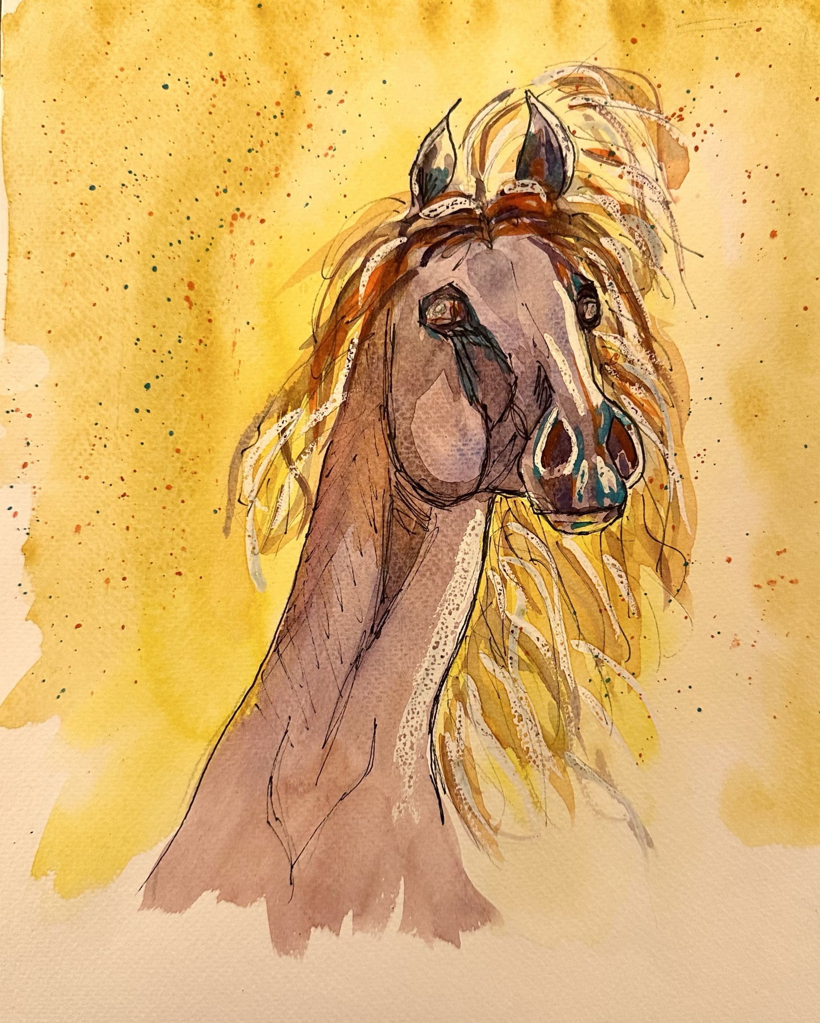 Angela used pastels for her horse picture, using rich browns and tan colours for her bold horse head portrait.