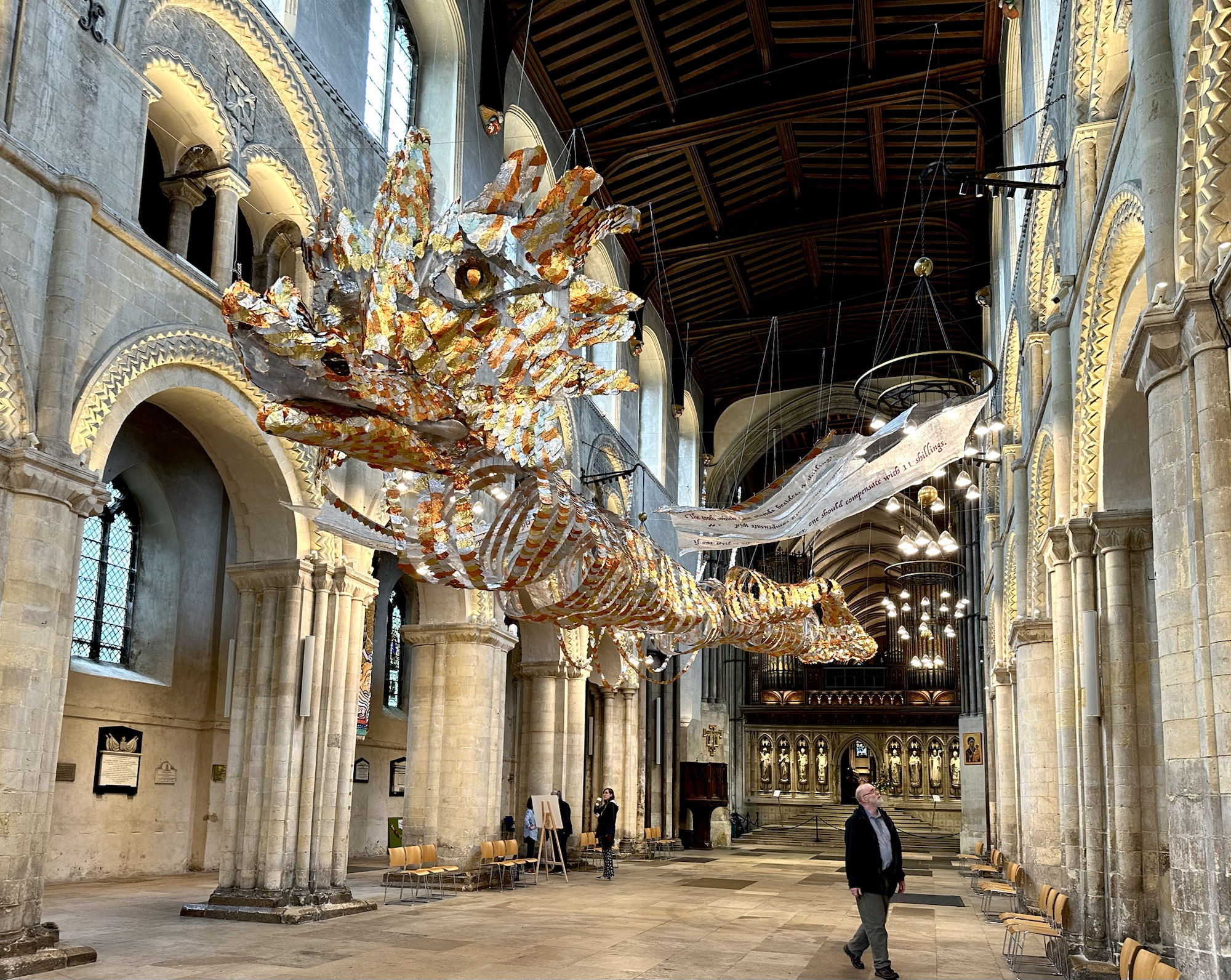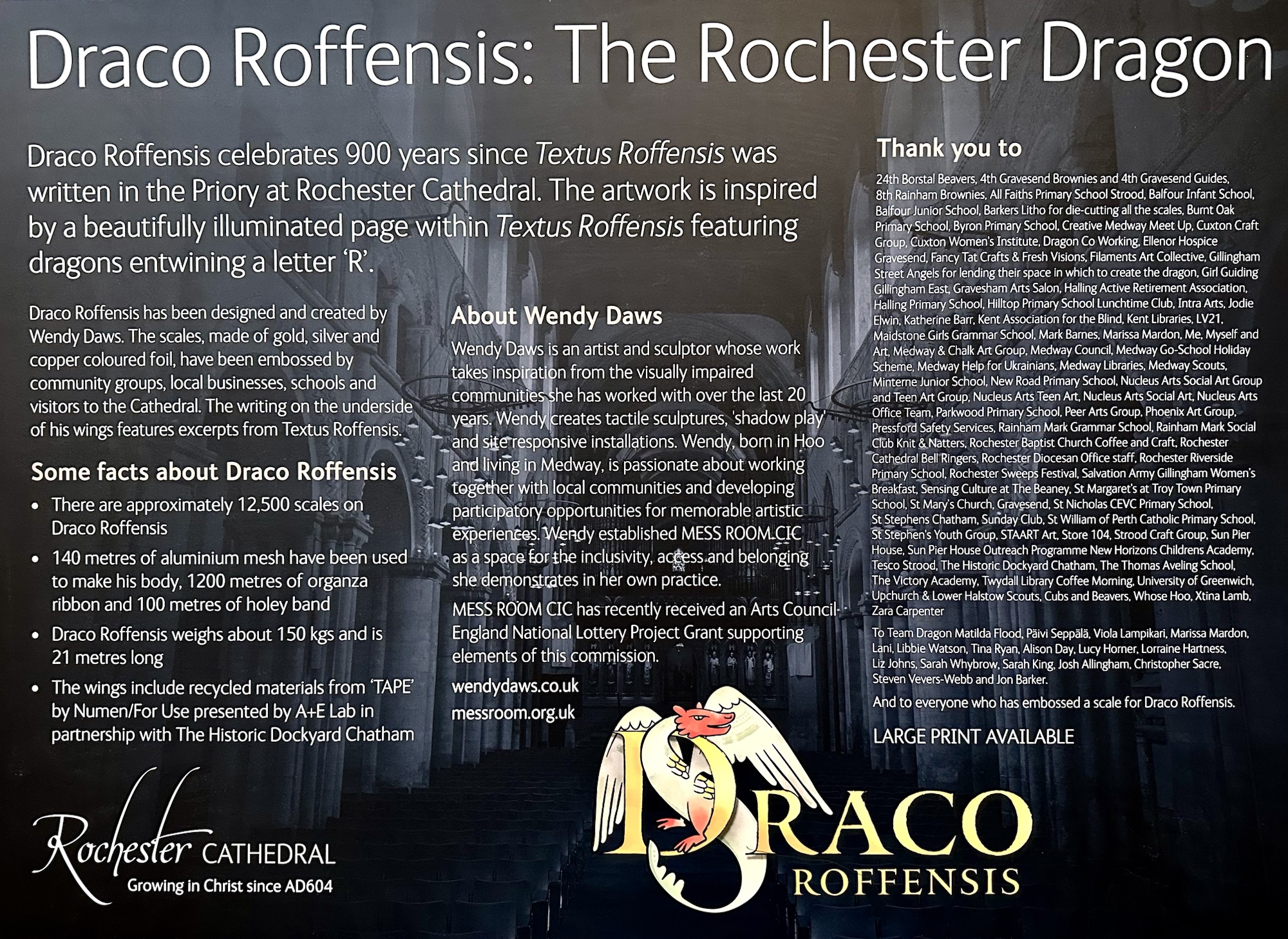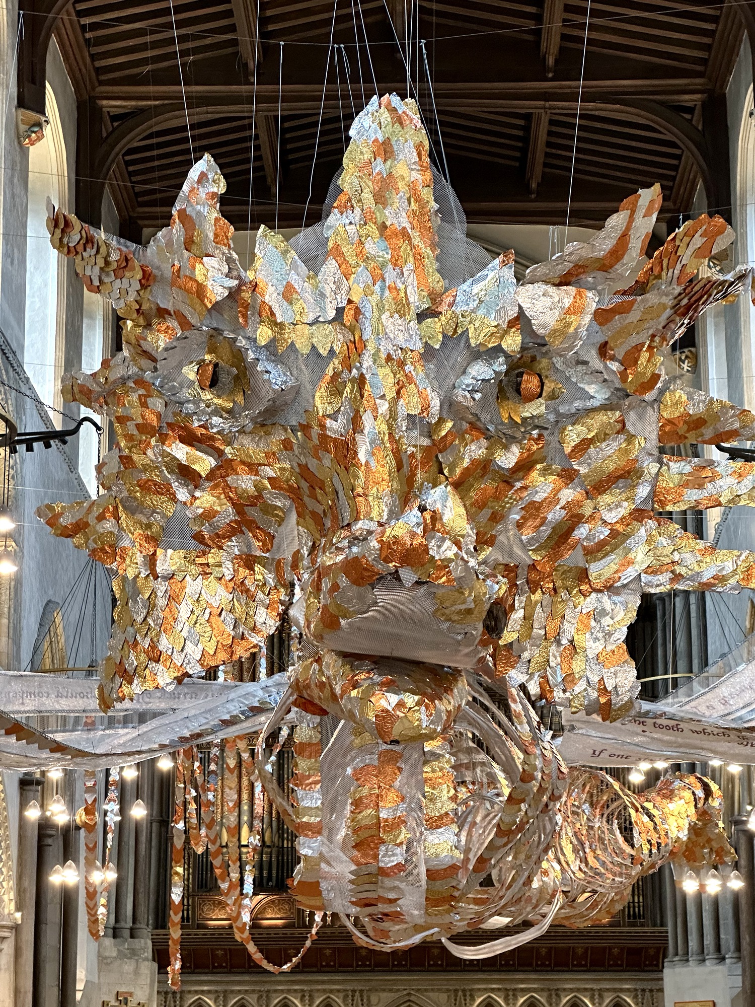 A few months ago some members embossed metal scales for a project at the cathedral. 12500 scales now adorn the Draco Roffensis dragon sculpture that is hanging above the nave. Here are photos of the sculpture and views in and around the cathedral.