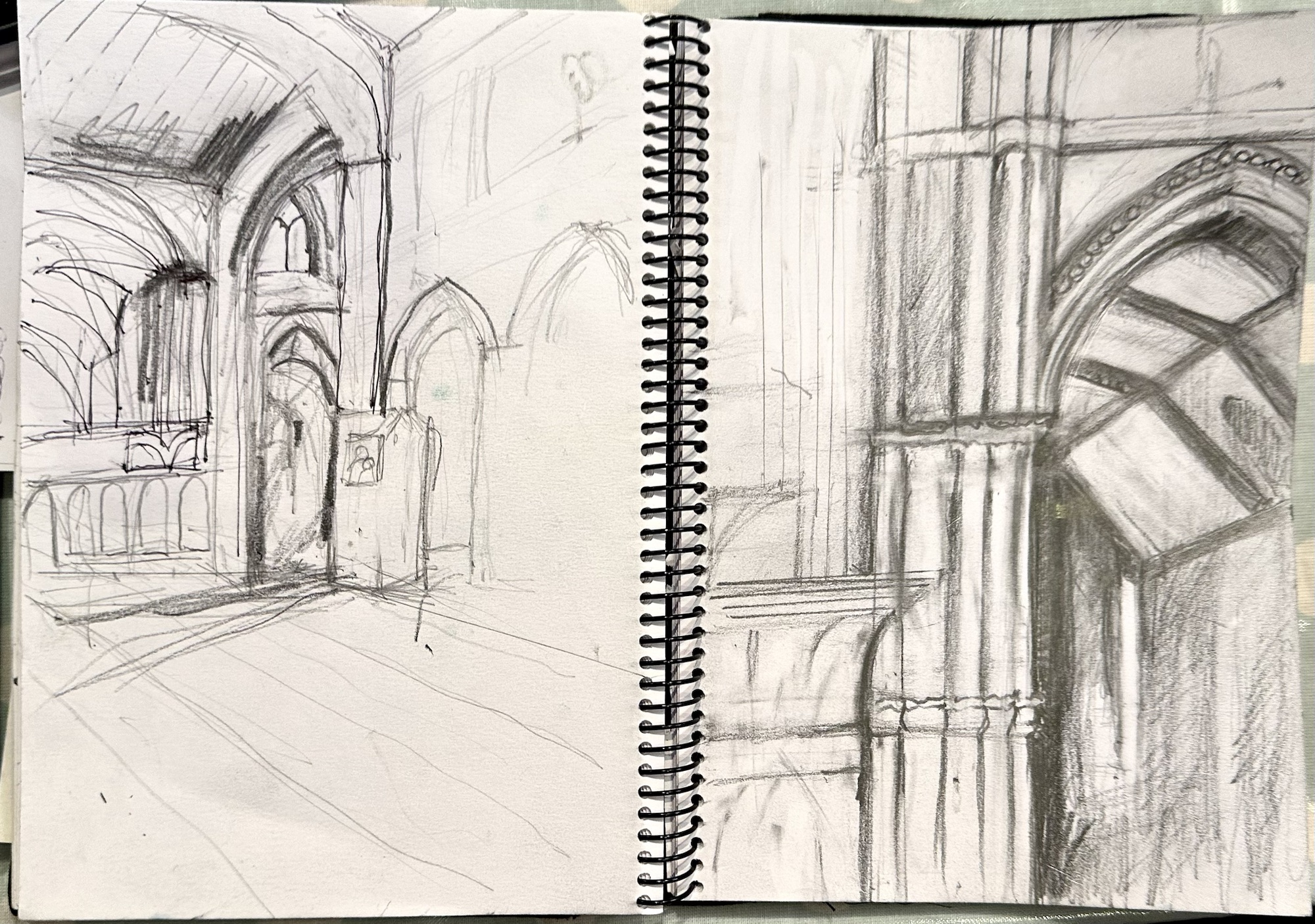 Our plans to return to the King’s Orchard, the private gardens behind Rochester Cathedral, were thwarted by the very heavy rain that fell for hours on Saturday. A huge thank you to Kay who got permission for us to draw in the cathedral instead, where we were based on tables in the north transept right by the stone rood screen. Some members used their folding chairs to sit by the tall columns in the nave.