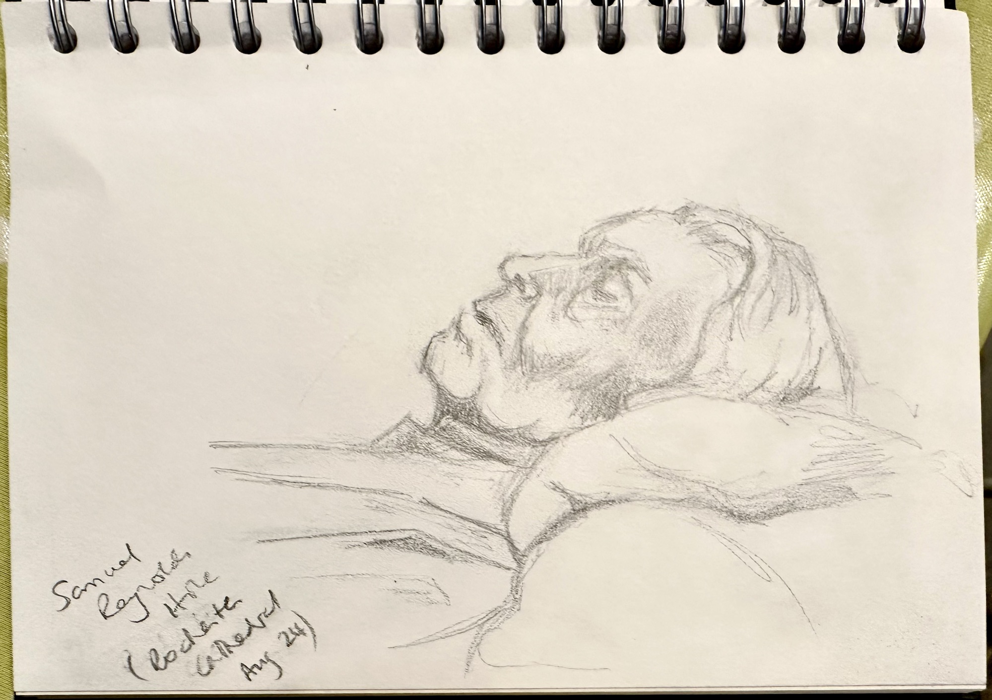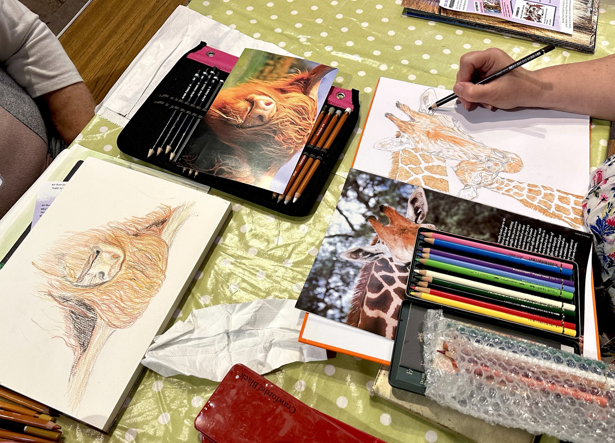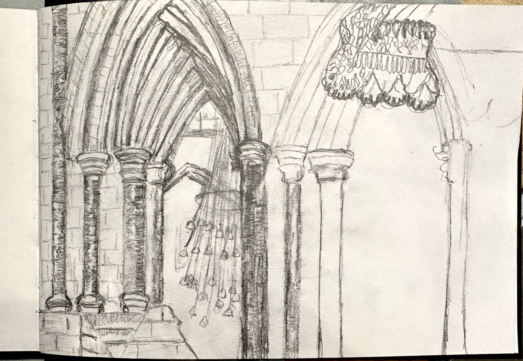 We couldn’t use any paint or water inside the cathedral so everyone sketched using dry mediums of pencils, coloured pencils, charcoal and pens. Most members drew the architecture and views around them but as usual we don’t mind at all if you come along to a session and ‘do your own thing’, so a giraffe and highland cow join the gallery. We start off with the girls’ pictures, including a super picture of Grandad Ron…