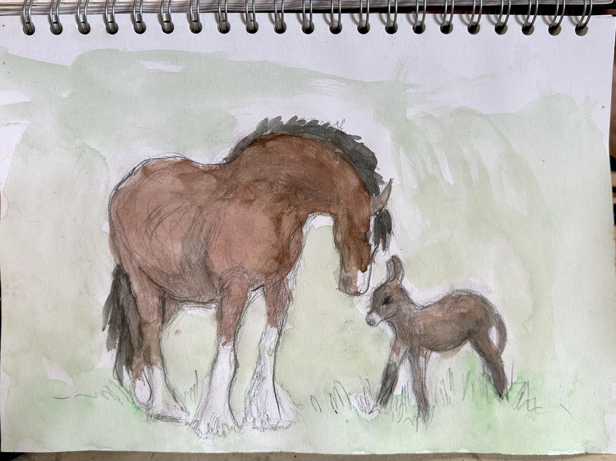 Mary found an adorable photo of a huge shire horse and donkey foal in a newspaper, drew it carefully and painted it in watercolours.