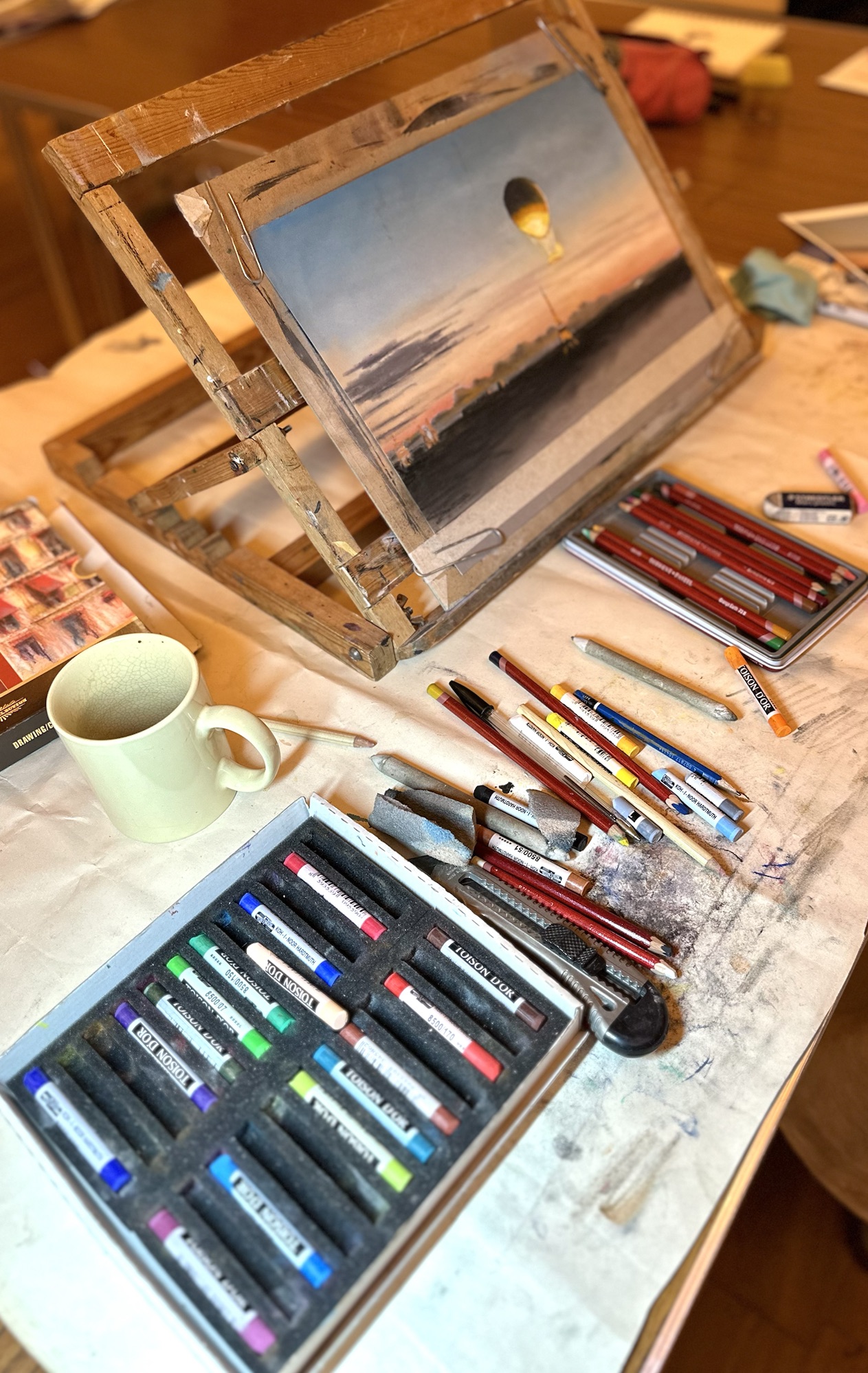 Steve’s posterised image of Frida Kahlo was painted in acrylics and the other in black pastel on grey pastel paper with a dramatic pop of lip colour in pink. Chalk Church was created when we visited last month, again in pastel but using many colours for a realistic picture.