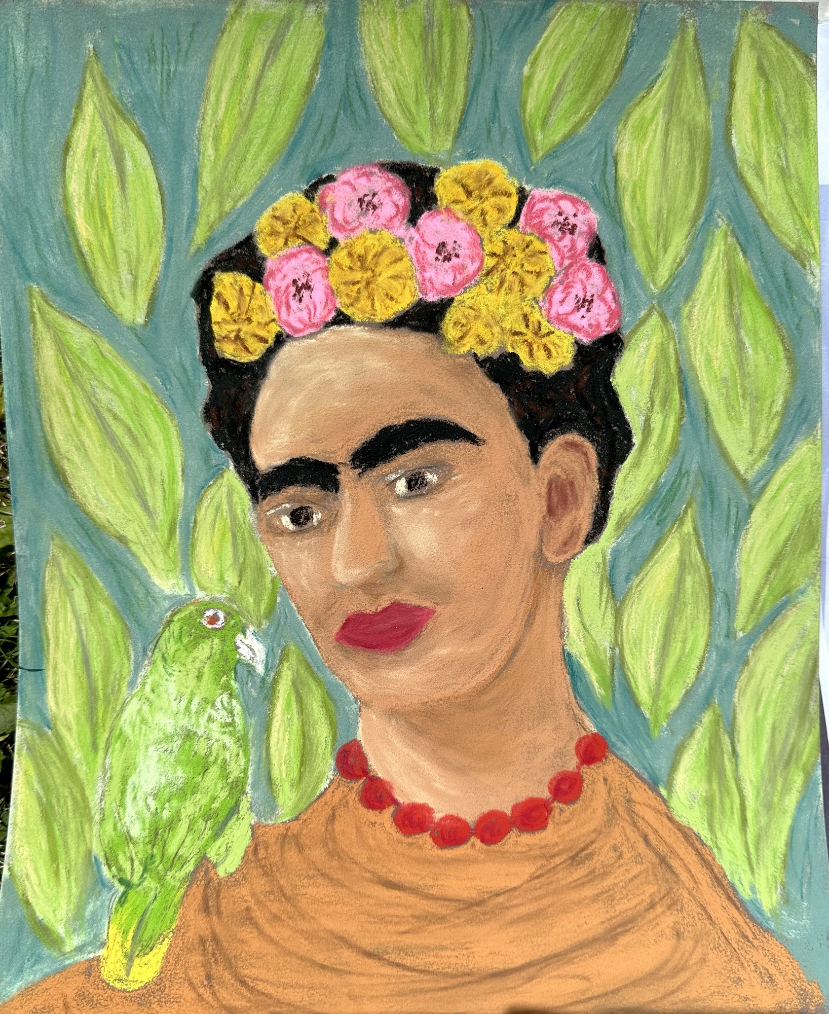 Brenda’s colourful picture of Frida Kahlo is in pastels as are her images of the dragon and the parrot on a dictionary page. The cockerel is painted in watercolours.