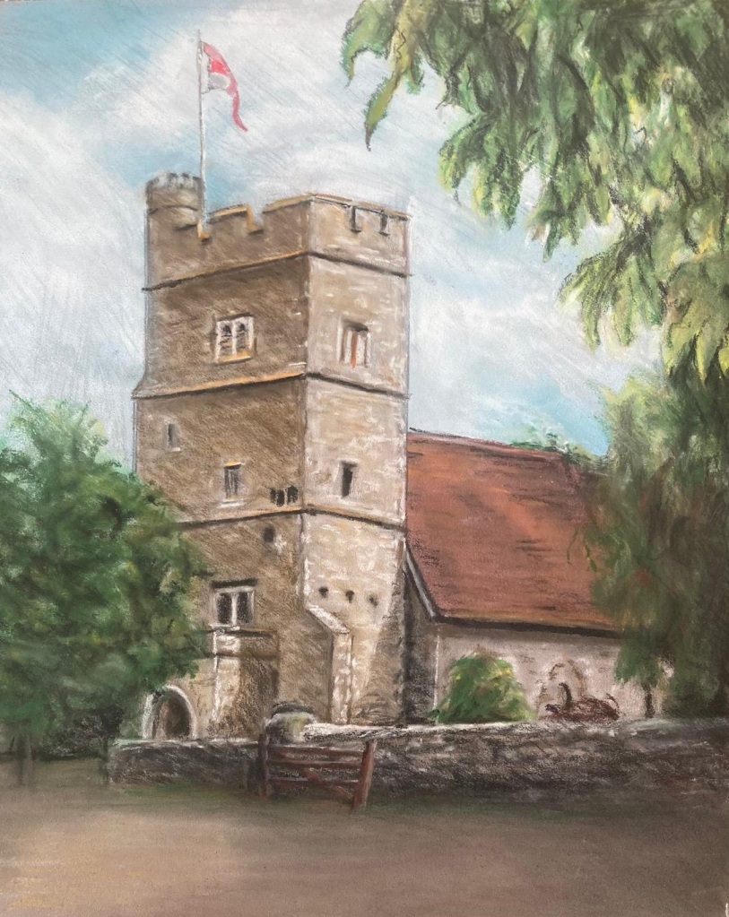 Steve’s posterised image of Frida Kahlo was painted in acrylics and the other in black pastel on grey pastel paper with a dramatic pop of lip colour in pink. Chalk Church was created when we visited last month, again in pastel but using many colours for a realistic picture.