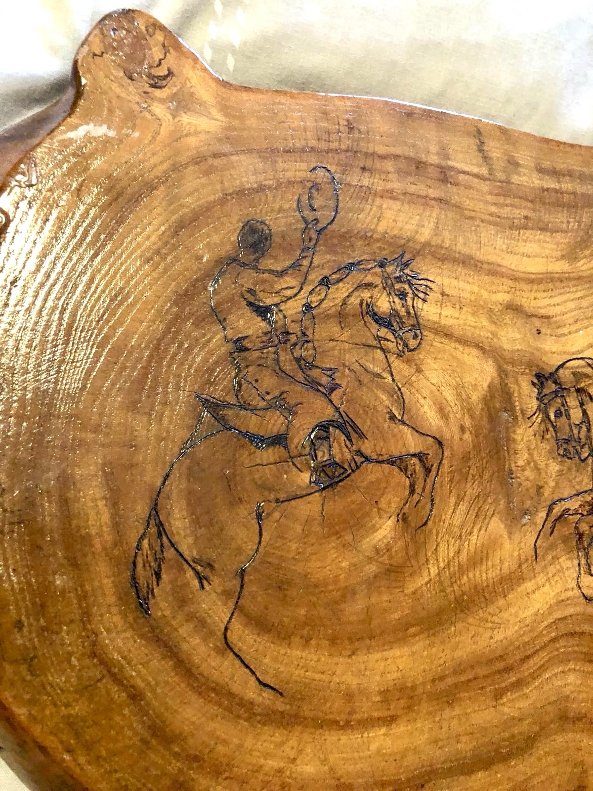 Kay was disappointed not to come to the session as she loves horses. At home she found her sketching book which she had begun at just 5 years old and continued with until her mid teens. The pyrography was done when she was 14 and the last image was painted a couple of years ago as a gift for a friend of her own horse.
