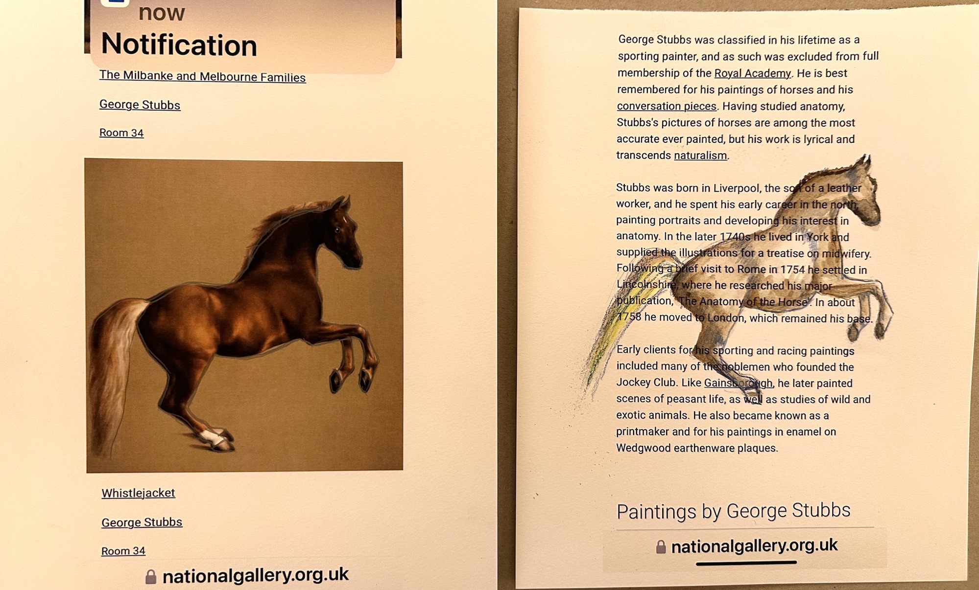 Janet W printed words about Stubbs on to Bockingford watercolour printer paper and painted a picture of Whistlejacket over the top in watercolour. She used the watercolours quite dryly so the words didn’t smudge. The painting is already framed as has just been exhibited in a Gravesend Art Group exhibition in the St.George’s Art Centre.