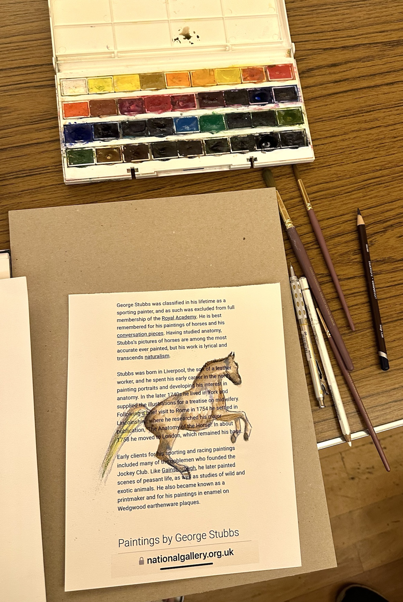 It was lovely to see ten members at the session, all eager to try their hand at drawing and painting horses, which we all thought was quite a challenge. The session was inspired by the birth of George Stubbs 300 years ago this month and his extraordinary paintings of horses in Georgian Britain. His most famous painting is ‘Whistlejacket’ in The National Gallery in London where visitors admire the horse’s perfectly formed body against a plain background so nothing distracts from the horse himself.
