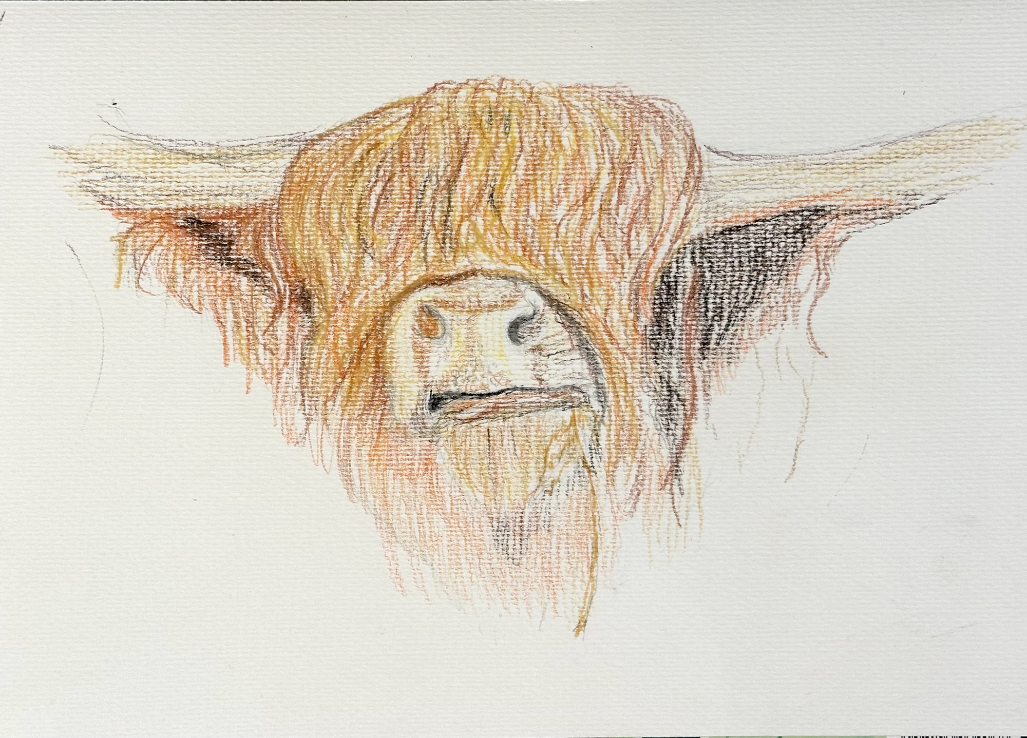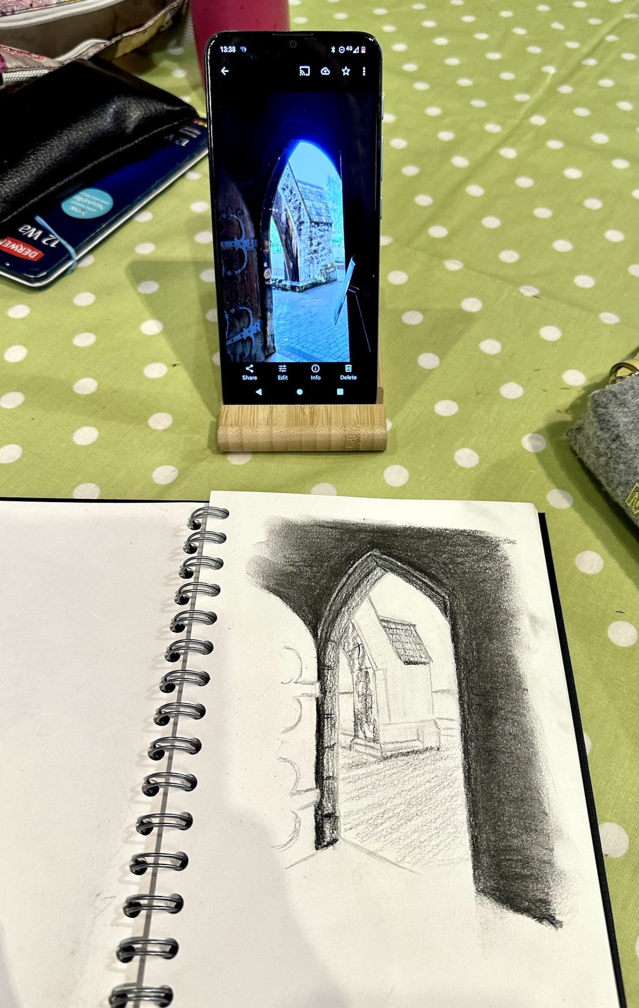 We couldn’t use any paint or water inside the cathedral so everyone sketched using dry mediums of pencils, coloured pencils, charcoal and pens. Most members drew the architecture and views around them but as usual we don’t mind at all if you come along to a session and ‘do your own thing’, so a giraffe and highland cow join the gallery. We start off with the girls’ pictures, including a super picture of Grandad Ron…