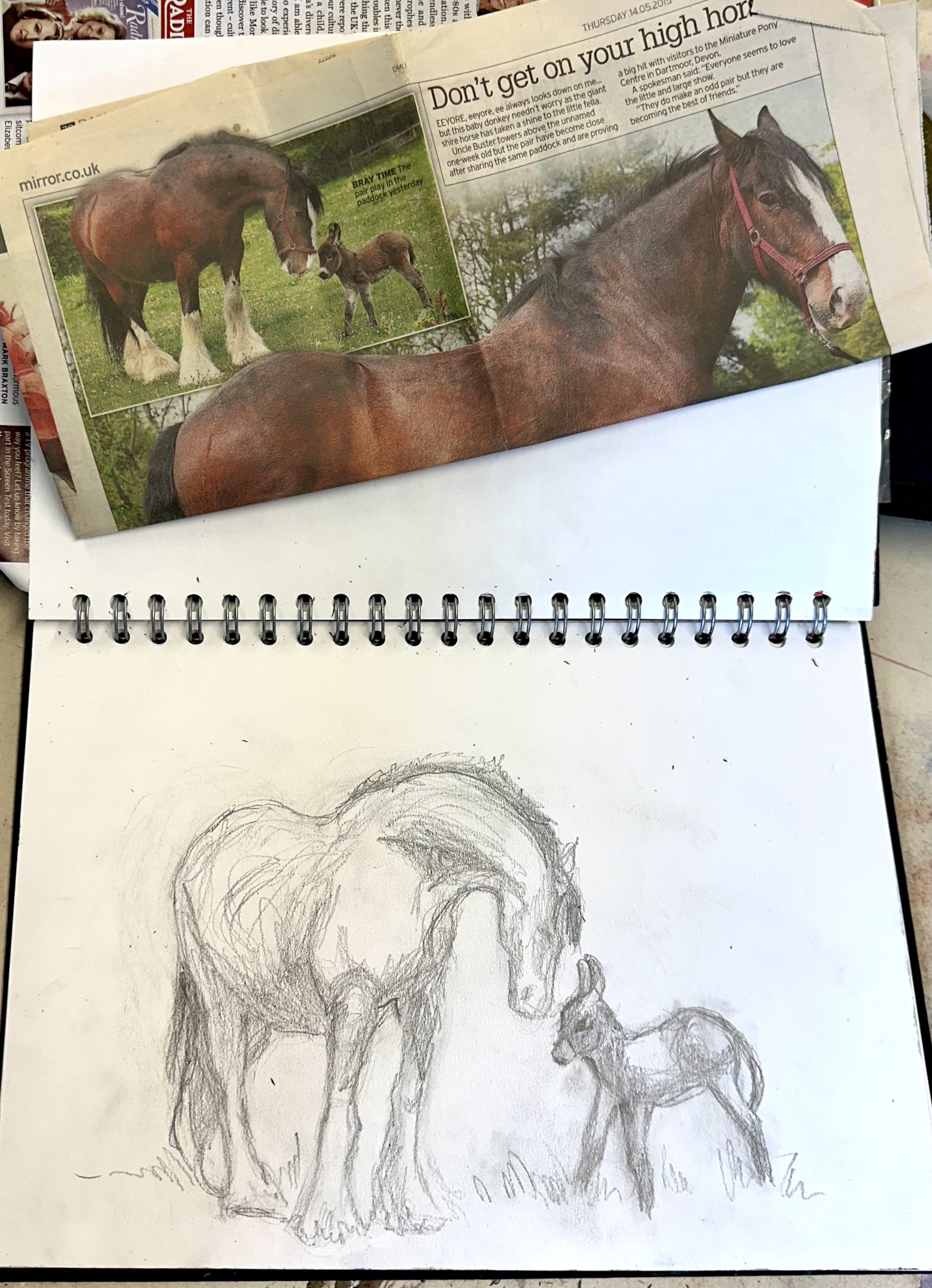 Mary found an adorable photo of a huge shire horse and donkey foal in a newspaper, drew it carefully and painted it in watercolours.